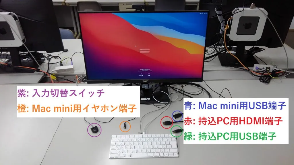 ECCSのMac mini端末に接続されているディスプレイとマウスは,利用者が持ち込んだノートPC等(持ち込みPC)に接続して利用できます(なお,このページで紹介する方法で利用できるのはディスプレイとマウスのみで,キーボードは利用できません).