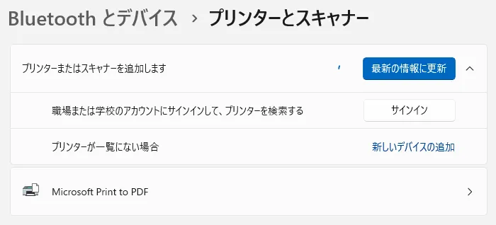 - スタートメニュー等から「設定」を開き,「Bluetoothとデバイス > プリンターとスキャナー」を開いてください.