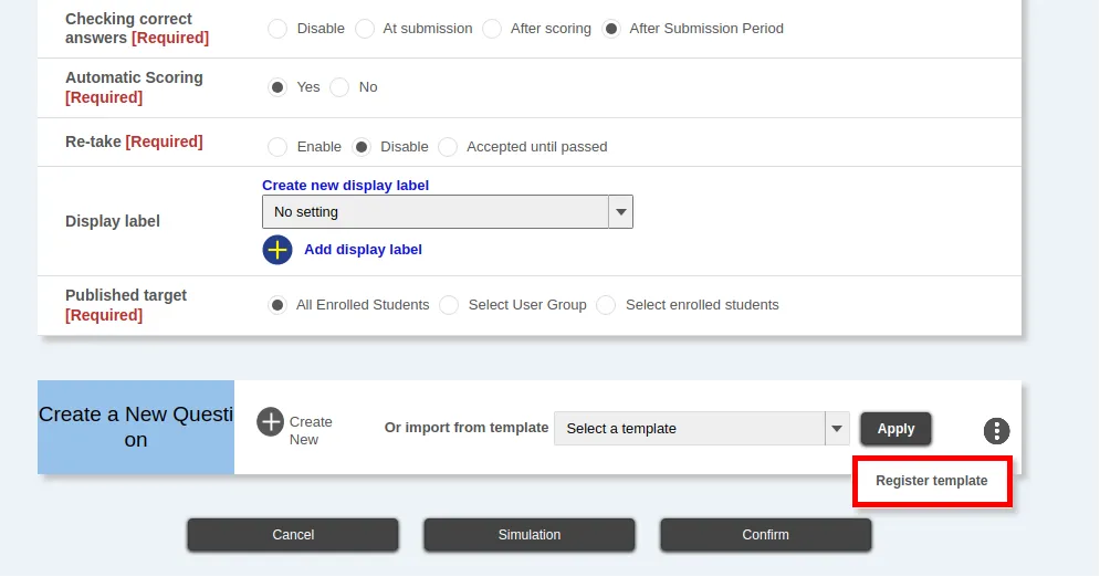 - When the “Confirm Quizzes template” screen appears, check that the template details you are registering are correct, then click “Register”.