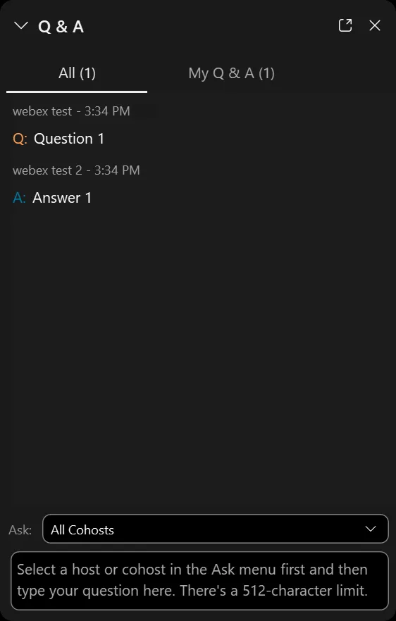 Click “Q&A” to send a question to the host, presenter, or (if you are using Webex Webinars) the panelist.