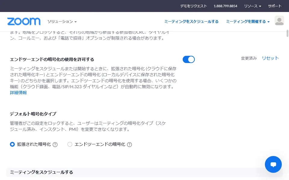 E2E暗号化を利用したい場合は,まず,Zoomの「設定」画面にて,「エンドツーエンドの暗号化の使用を許可する」をオンにしてください.この設定をオンにすると,ミーティングを作成(スケジュール)する際の設定に「暗号化」という項目が表示されるようになり,「エンドツーエンドの暗号化」と通常の「拡張された暗号化」の2種類の暗号化をミーティングごとに選択できるようになります.