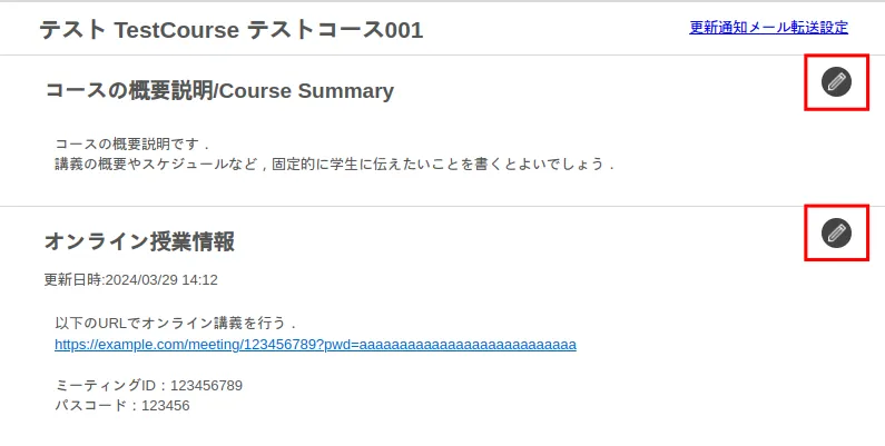 (鉛筆のマーク)を押すと編集できます.なお,「コースの概要説明」は,「コース設定→コースの概要説明」1からも編集画面を開くことができます.